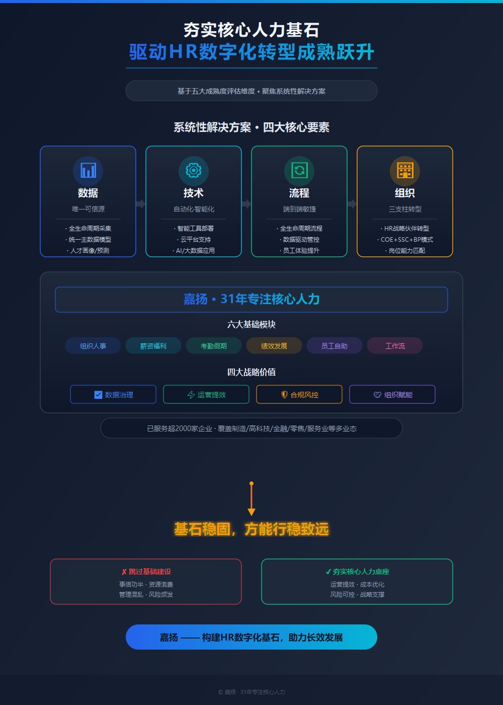 嘉扬——31年专注核心人力,为企业筑牢HR数字化基石,助力组织在数字化浪潮中行稳致远、长效发展。