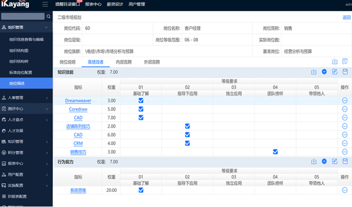 岗位基本信息( 岗位职责、工作说明、在岗人员、继任者、人才库等),岗位胜任力,岗位培训包,岗位绩效规则。